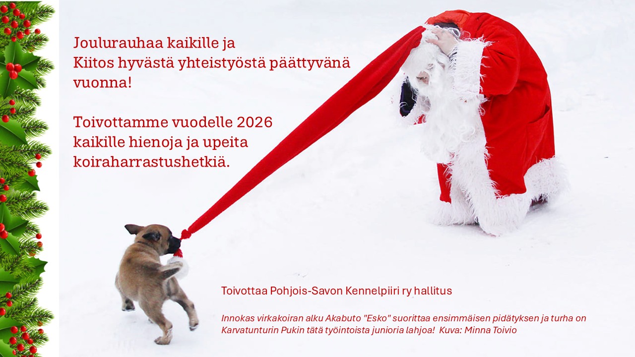 Jäämme kennelpiirissä Joulunviettoon. Palaamme sorvin ääreen jälleen loppiaisen jälkeen. Sihteeri päivystää akuuteissa asioissa, olkaa häneen tarvittaessa yhteydessä. Kiitos kaikille toimihenkilöillemme ja jaostoillemme sekä jäsenyhdistyksillemme hyvästä yhteistyöstä.Kiitos myös yhteistyökumppaneillemme vuodesta 2025.