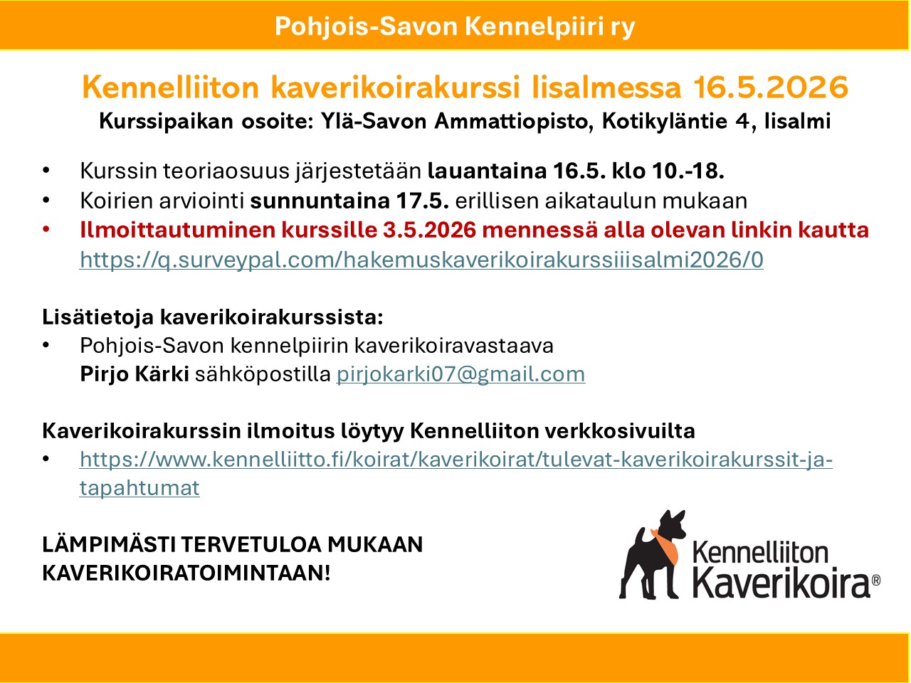 - Iisalmeen ilmoittautuminen https://q.surveypal.com/hakemuskaverikoirakurssiiisalmi2026/0